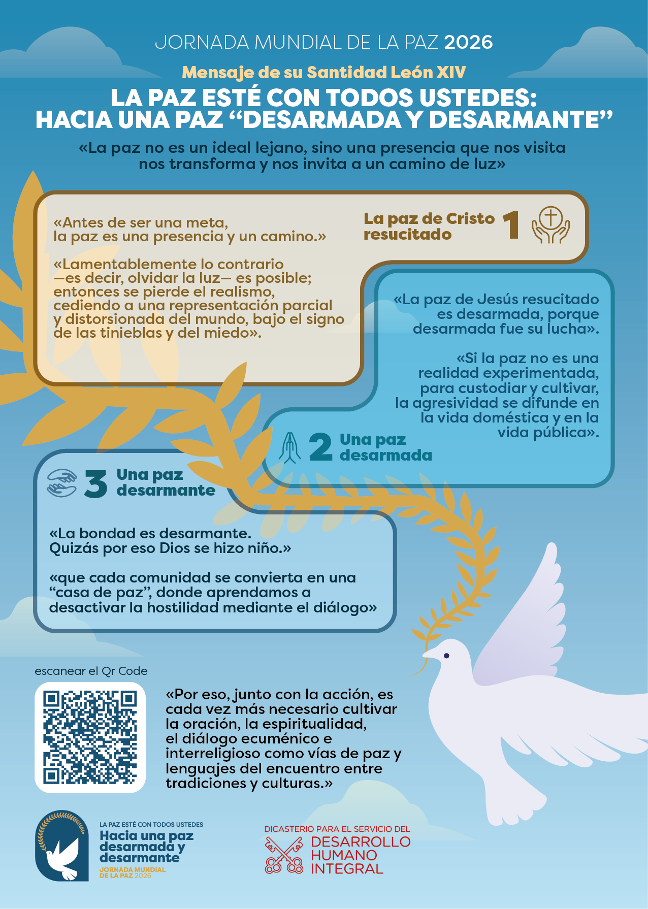 El Papa propone una paz "desarmada y desarmante", que rechaza la violencia, la lógica de la guerra y el miedo como formas de resolver los conflictos. No se trata solo de eliminar las armas, sino de desarmar el corazón, la mente y las palabras, superando el odio, el resentimiento y la desconfianza.