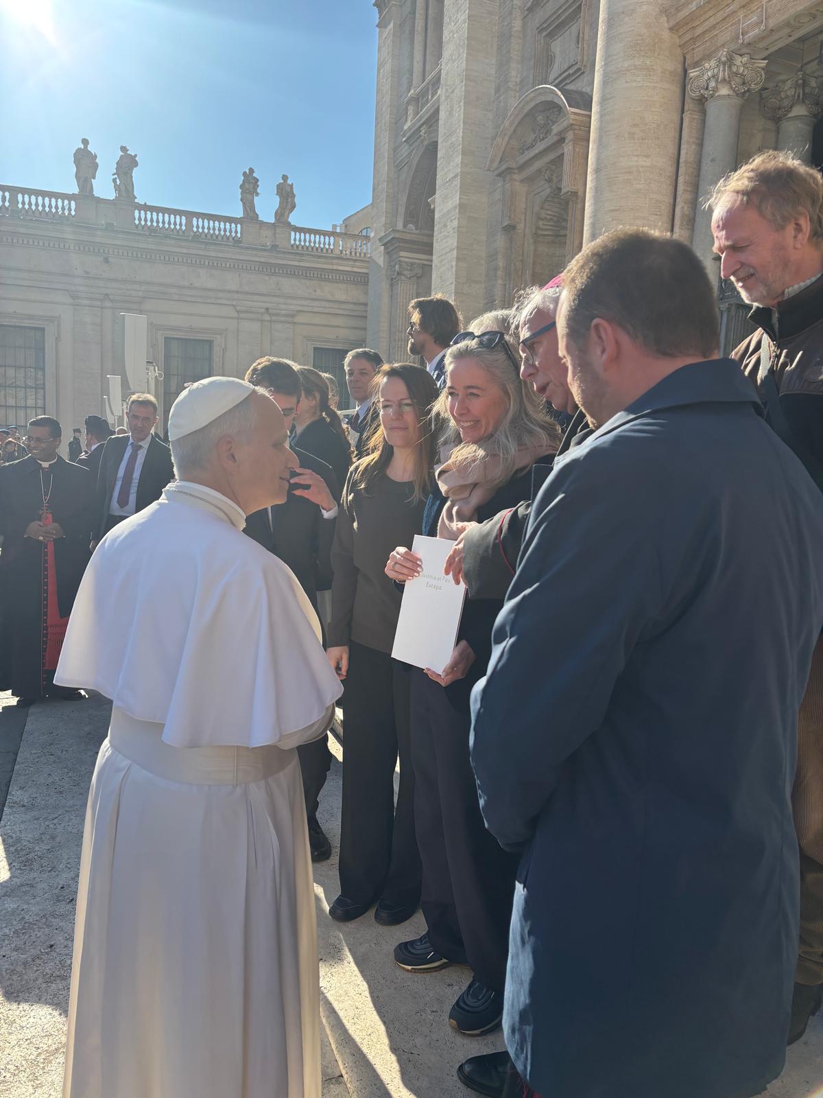 Durante un breve pero cordial encuentro que tuvo lugar tras la Audiencia General, los miembros del Comité Ejecutivo saludaron al Santo Padre y le entregaron la Declaración del Día de los Derechos Humanos 2025 de Justicia y Paz Europa y la Acción Concertada de este año titulada «Esperanza para el mundo del trabajo». En respuesta, el Papa agradeció a Justicia y Paz Europa su labor. La ocasión, que coincidió con el Día Internacional de los Derechos Humanos, brindó una oportunidad significativa para reafirmar el compromiso de Justicia y Paz Europa con la defensa de la dignidad humana y los derechos fundamentales en Europa y más allá. El Comité Ejecutivo de Justicia y Paz Europa se reunió en Roma del 9 al 11 de diciembre de 2025.