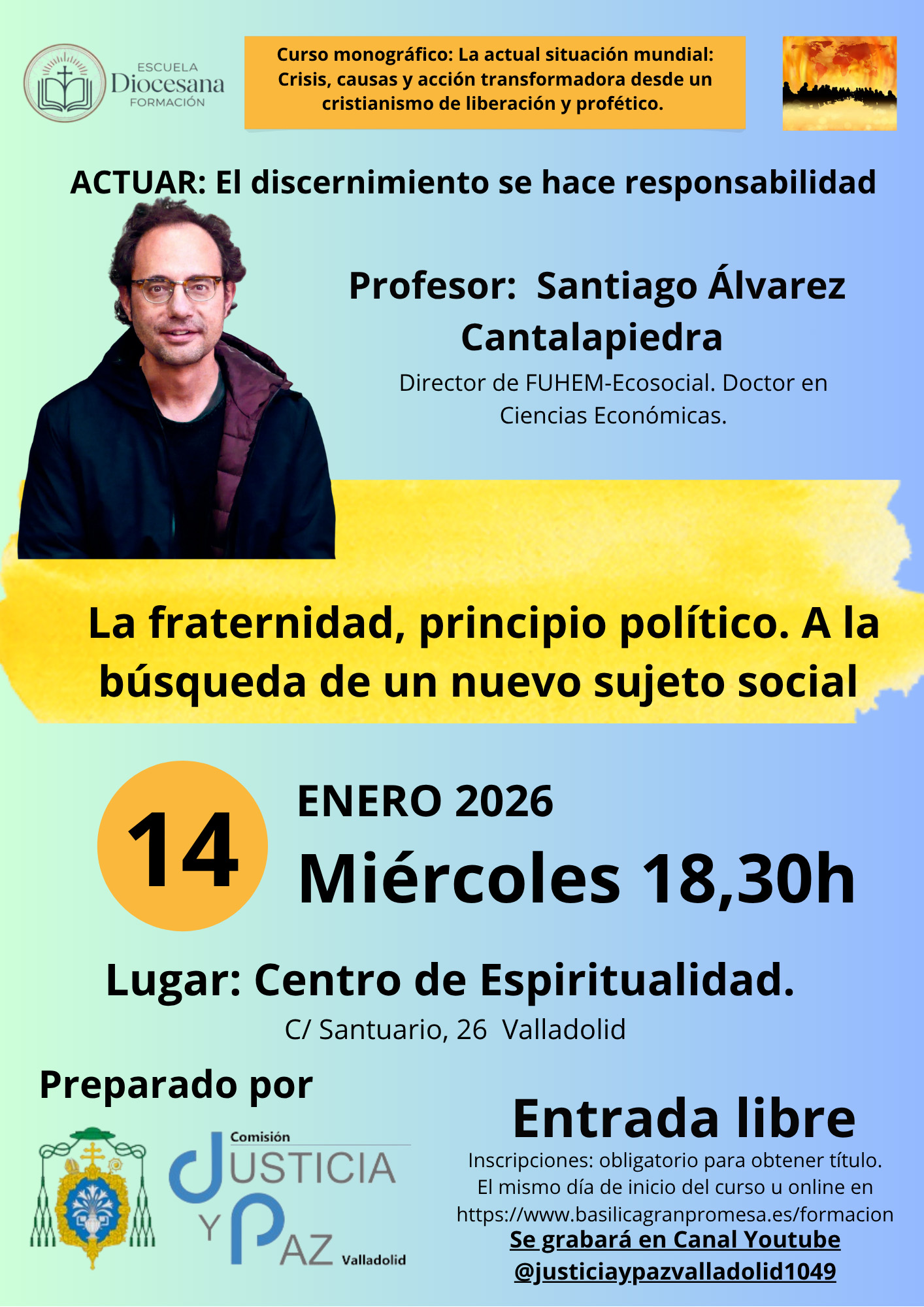 estos cambios, discernir sus implicaciones éticas y teológicas, proponiendo caminos de acción y de esperanza para la construcción de un mundo más justo, fraterno y sostenible, en línea con los valores del evangelio y las enseñanzas sociales de la Iglesia. En las sesiones colabora Fe y Desarrollo de Valladolid.